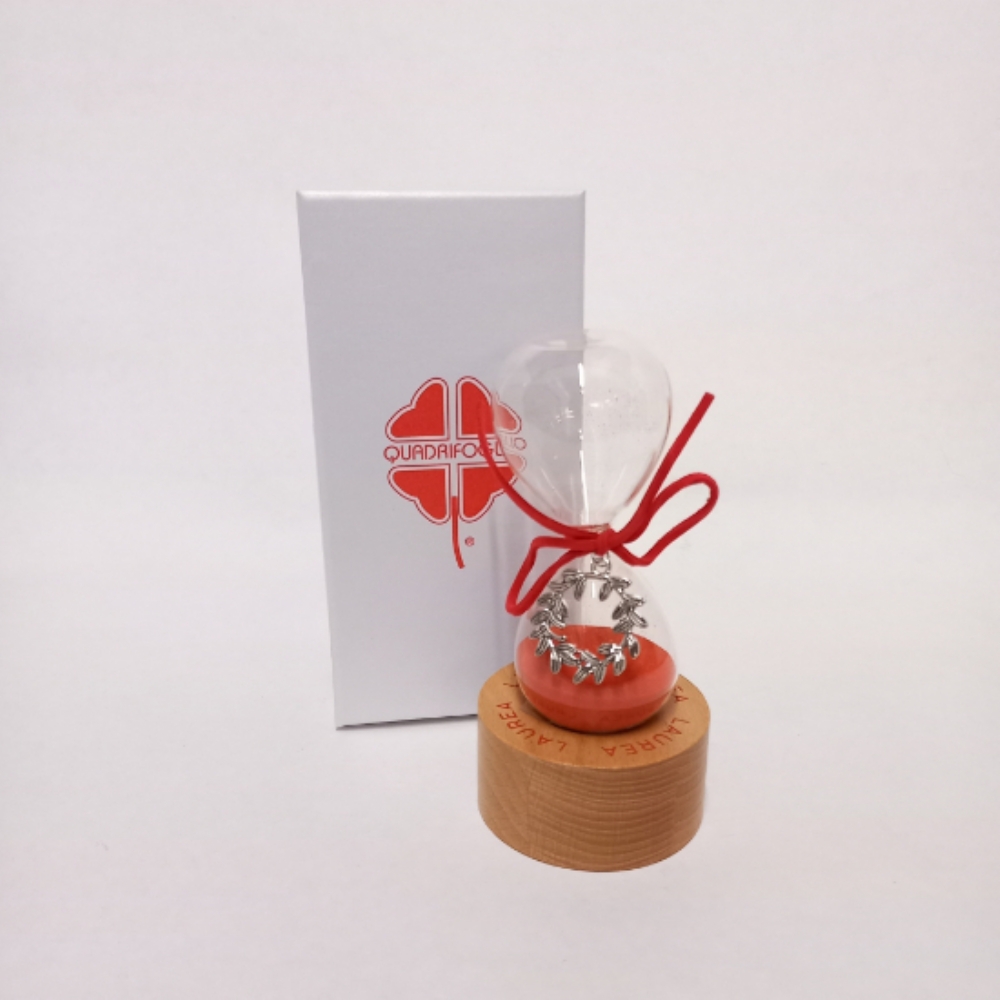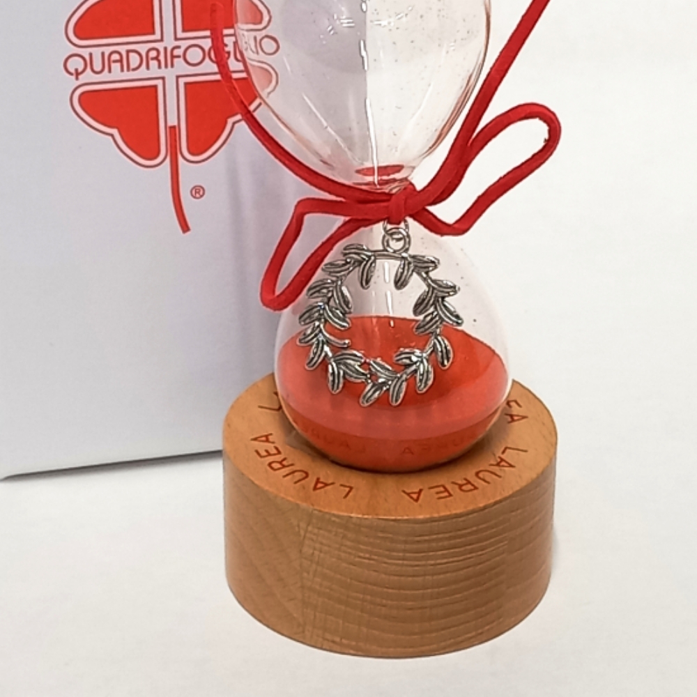 La clessidra è in vetro trasparente e la sabbia al suo interno è rossa, abbinata a un laccio che si avvolge al centro per contenere la bellissima applicazione che rappresenta la corona di alloro. La base è in legno cona la scritta "LAUREA" sulla parte superiore.