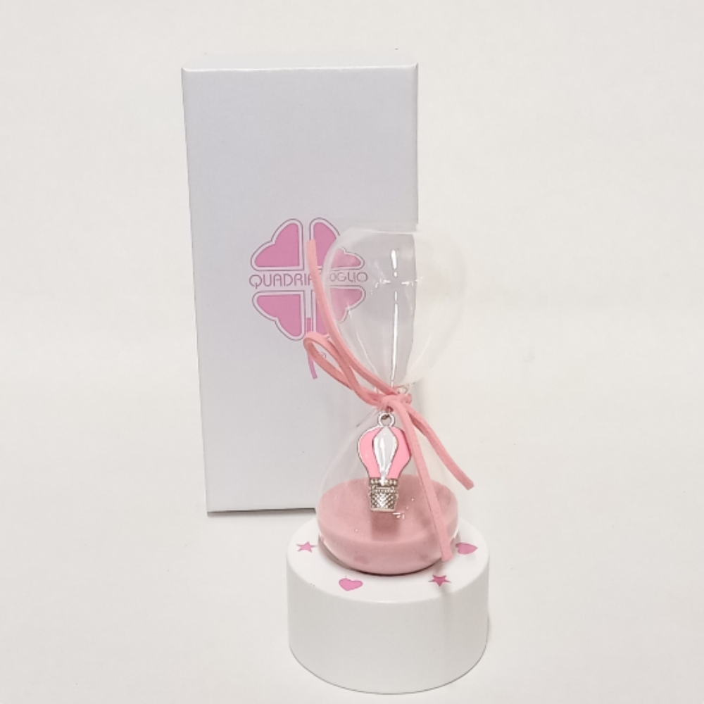 La clessidra è in vetro trasparente e la sabbia al suo interno è rosa, abbinata a un laccio che si avvolge al centro per contenere la bellissima applicazione a mongolfiera. La base è in legno bianco e decorata con stelle rosa sulla parte superiore.