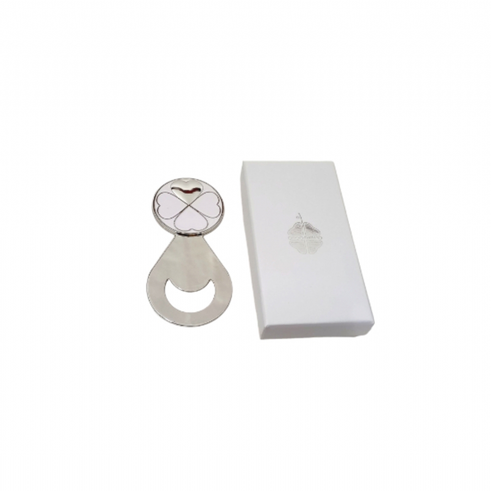 Apribottiglia in metallo con personalizzazione quadrifoglio.