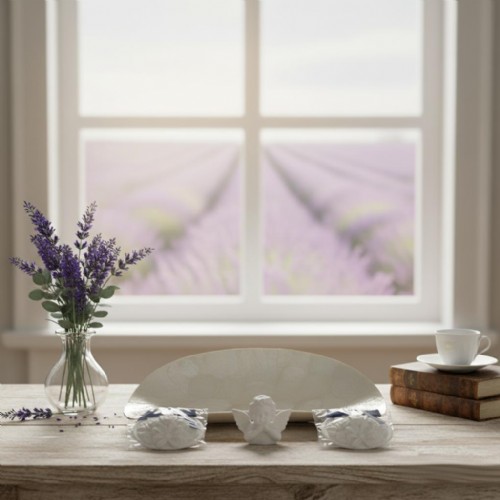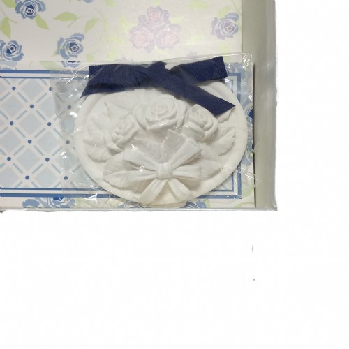 Aura Romantica e Profumata: Accompagnano il piatto due medaglioni ovali in gesso profumato, finemente decorati con un mazzo di fiori e un elegante nastrino blu. Sono ideali per profumare delicatamente armadi, cassetti o per essere posizionati nel bagno, diffondendo una piacevole fragranza. Il set è completato dal tenero gessetto a forma di Angioletto, un piccolo dettaglio che aggiunge un tocco di grazia e dolcezza.