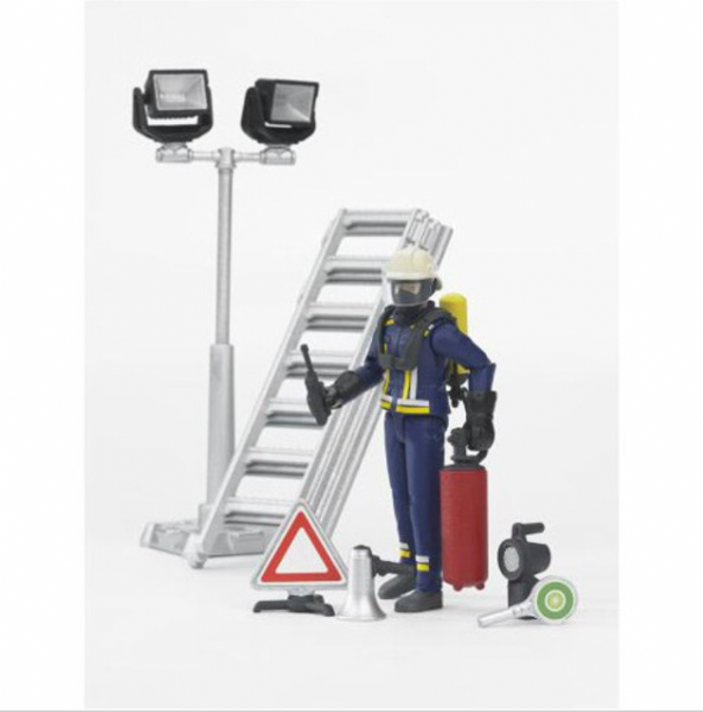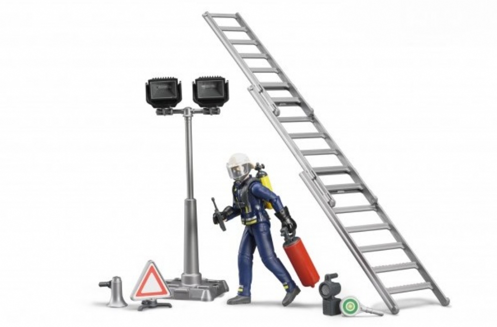 La confezione contiene un pompiere in uniforme, la scala allungabile, estintore, guanti, casco con visiera, torcia, bombola di ossigeno e maschera respiratore, lampade montate su un palo allungabile, megafono, radio, triangolo d'emergenza e paletta.