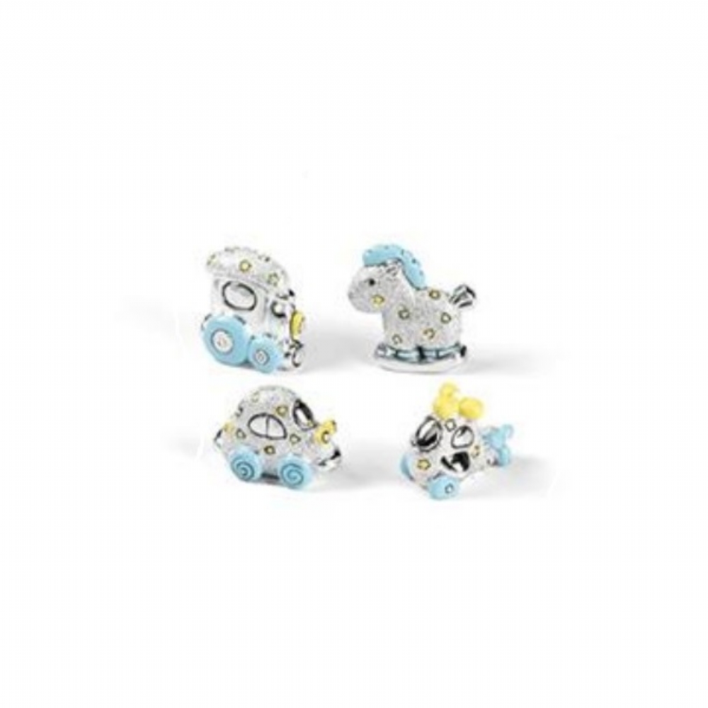 Soggetti in resina placcata in 4 soggetti assortiti, ideali per bomboniere per nascita o battesimo.