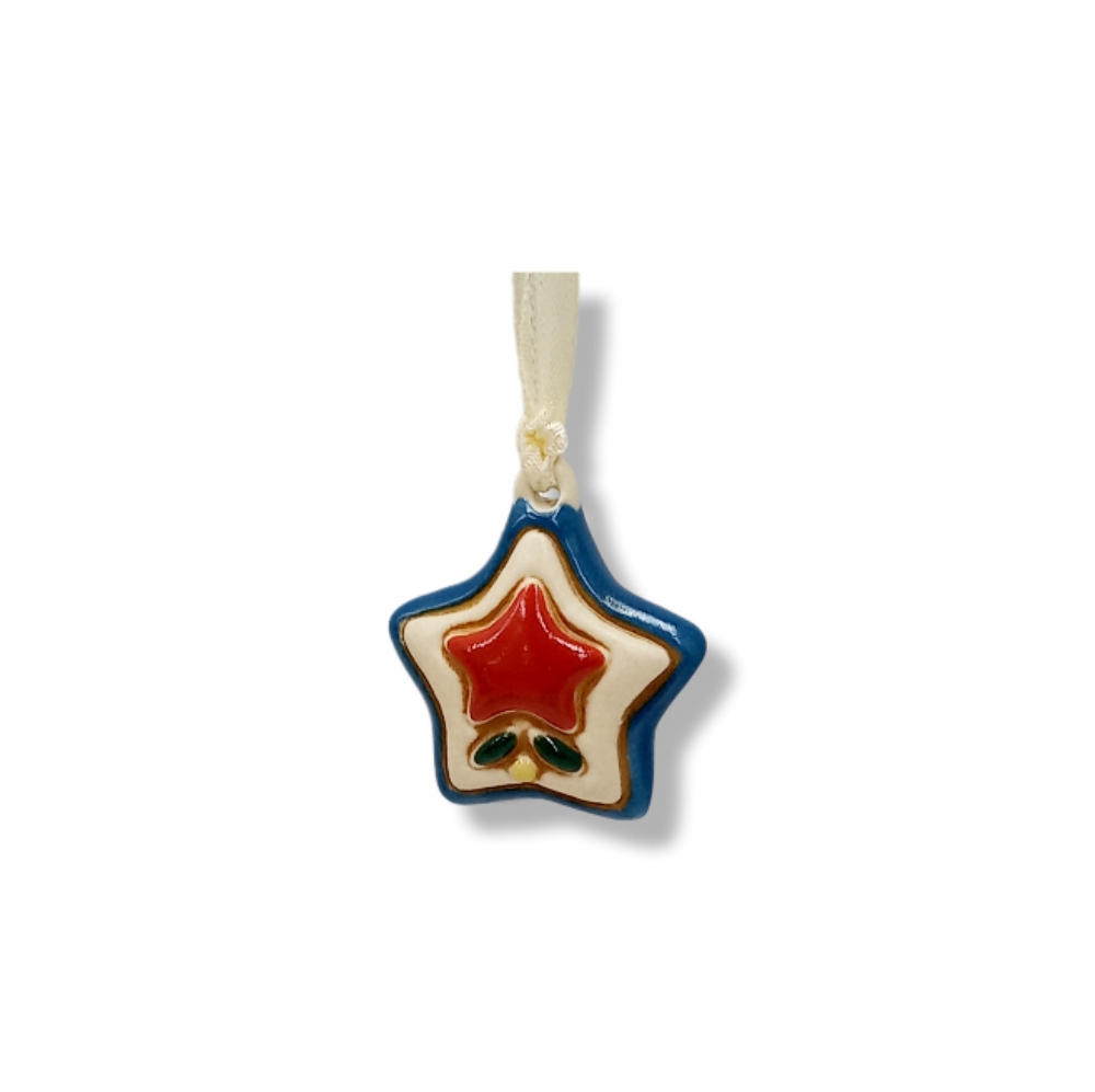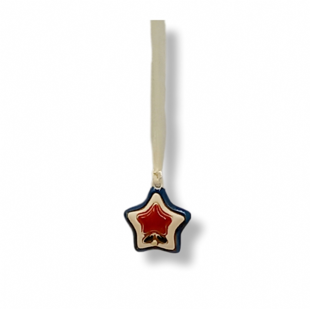 Ogni stella è un piccolo capolavoro dipinto a mano, caratterizzato da un design a doppio strato che crea un'affascinante profondità visiva. La base bianca o blu accoglie al suo interno una stella rossa o bianca, finemente decorata con piccoli dettagli verdi o blu. L'attenzione ai particolari e la pittura artigianale rendono ogni pezzo unico, emanando un calore e una bellezza senza tempo che solo il fatto a mano sa offrire.