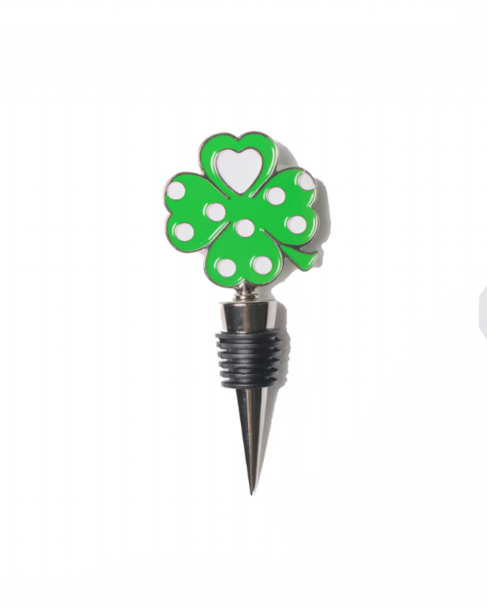 Tappo per bottiglia con inserto in metallo smaltato a forma di quadrifoglio.