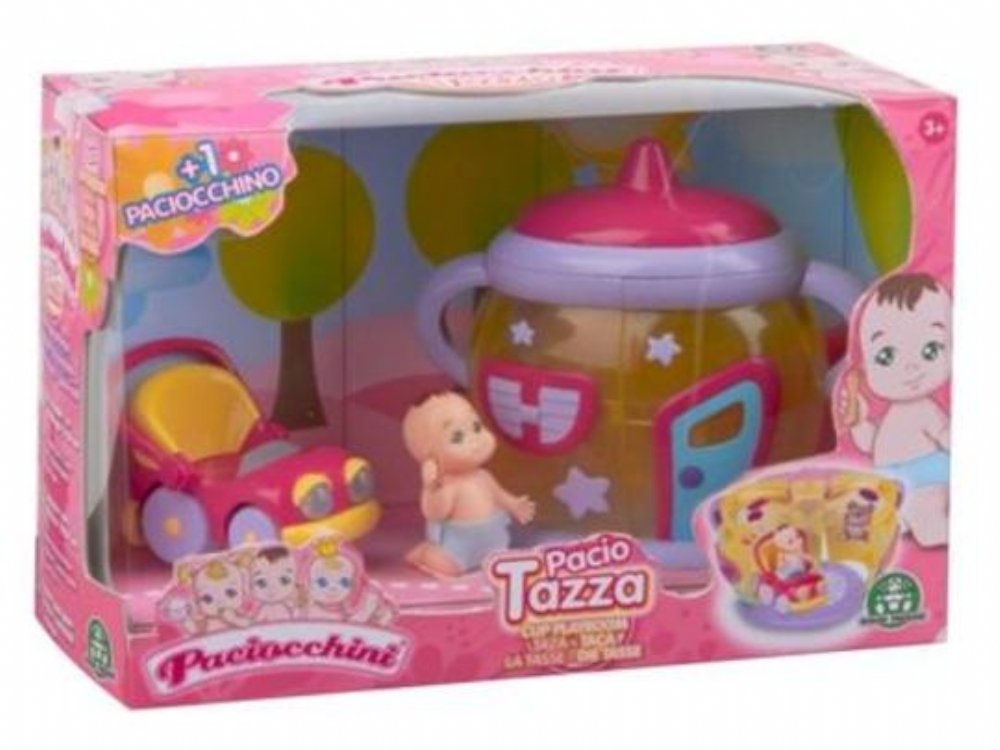 Simpatico play set a forma di tazza che si apre per diventare una divertente stanzetta per i paciocchini! Contiene anche un paciocchino ed 1 pacio-card