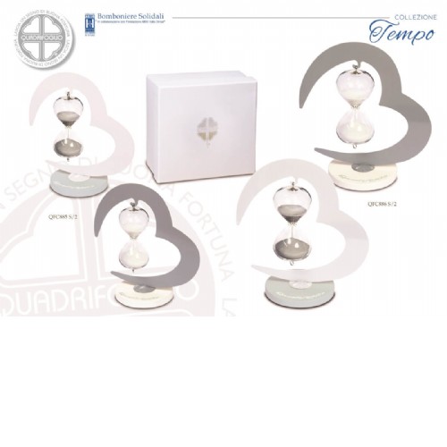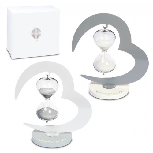 Realizzata in pregiato vetro trasparente, la clessidra poggia su un'elegante base in metallo che disegna un cuore stilizzato, rendendola il dono ideale per celebrare Matrimoni, Comunioni o Cresime. La sabbia, che scorre per circa 50 secondi, invita a un momento di riflessione sulla bellezza del tempo trascorso insieme.