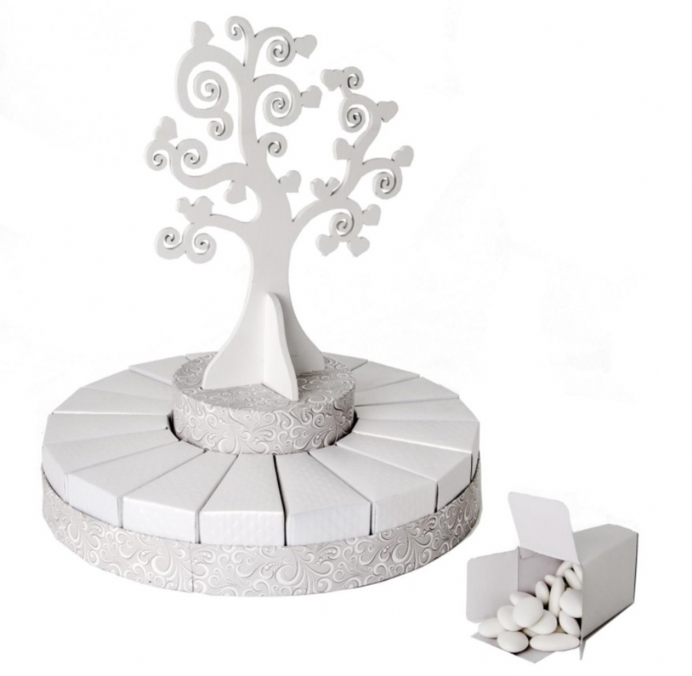 La confezione contiene un portatorta tondo diametro 30 cm, con 18 scatoline bianche portaconfetti (vuote) e decorazione centrale in legno bianco a forma di albero della vita.