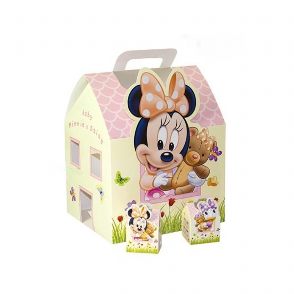 Scatolina portaconfetti a forma di casetta, personalizzata con immagini colorate di Minnie e Paperina, assortita nelle 2 versioni.