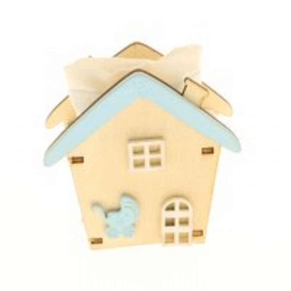 Scatolina portaconfetti a forma di casetta realizzata in foglia di legno, con sacchettino portaconfetti in tessuto abbinato.