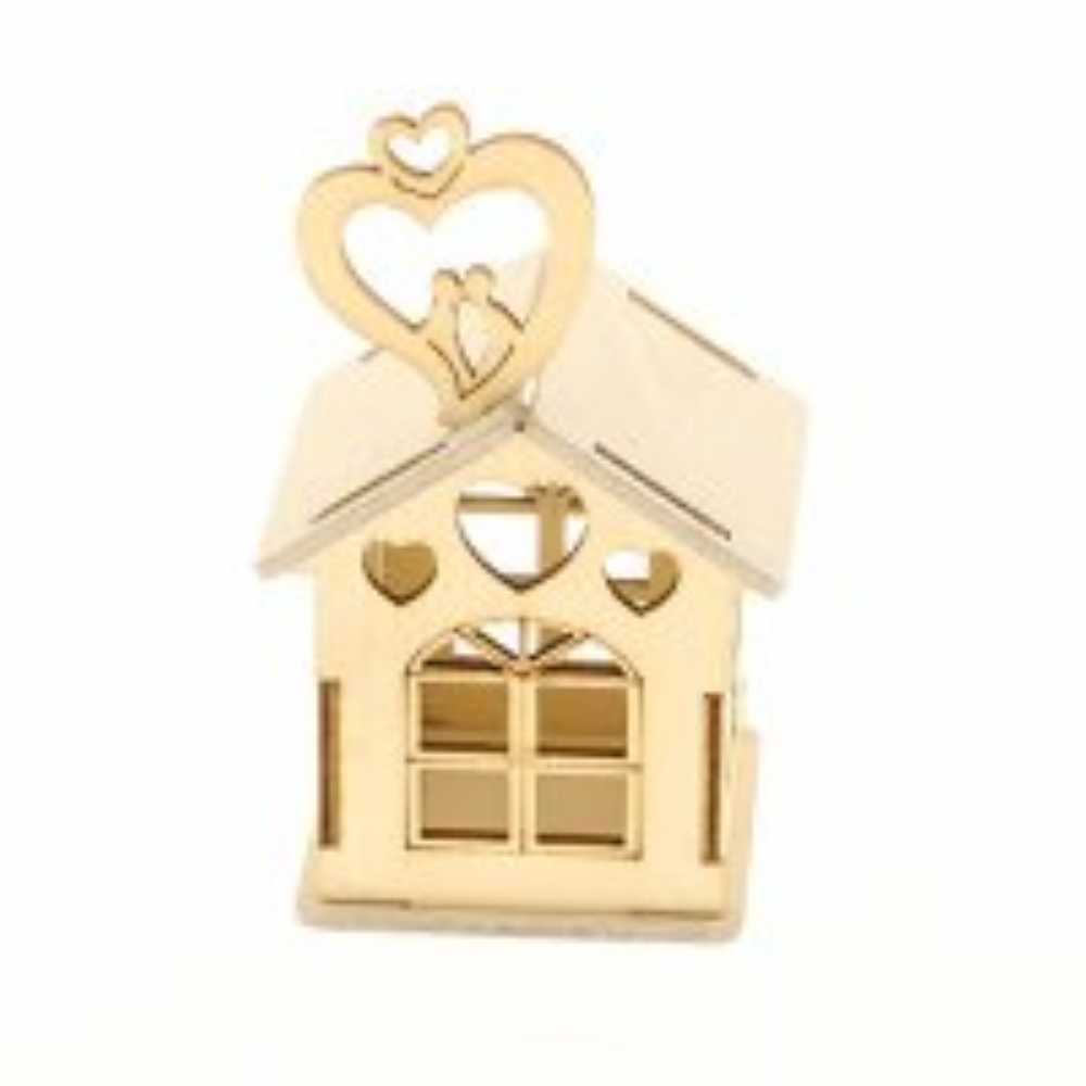Scatolina portaconfetti a forma di casetta realizzata in foglia di legno.